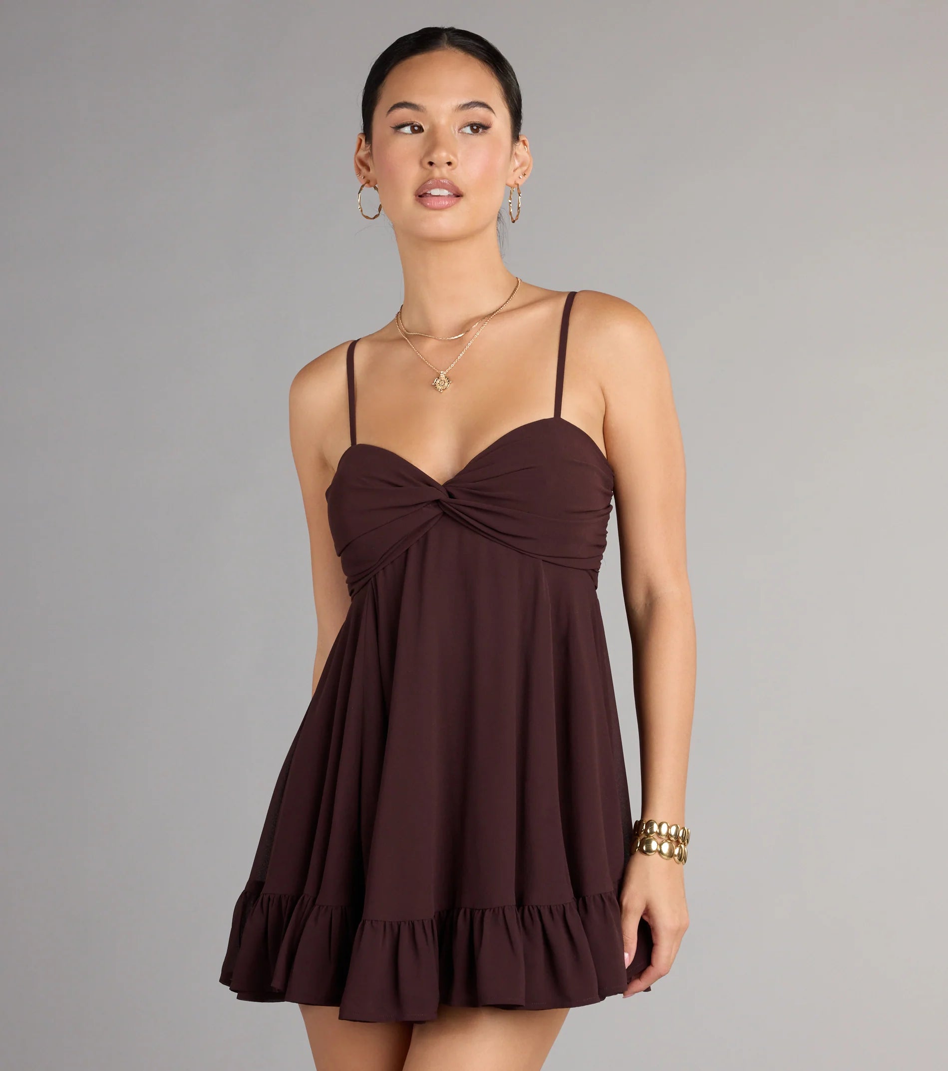 This dress features a lovely babydoll silhouette. It's a mini-length dress with a cute tie-back design and a ruffled hem, adding a touch of elegance to every step. Pair it with heels for events like showers or graduations.