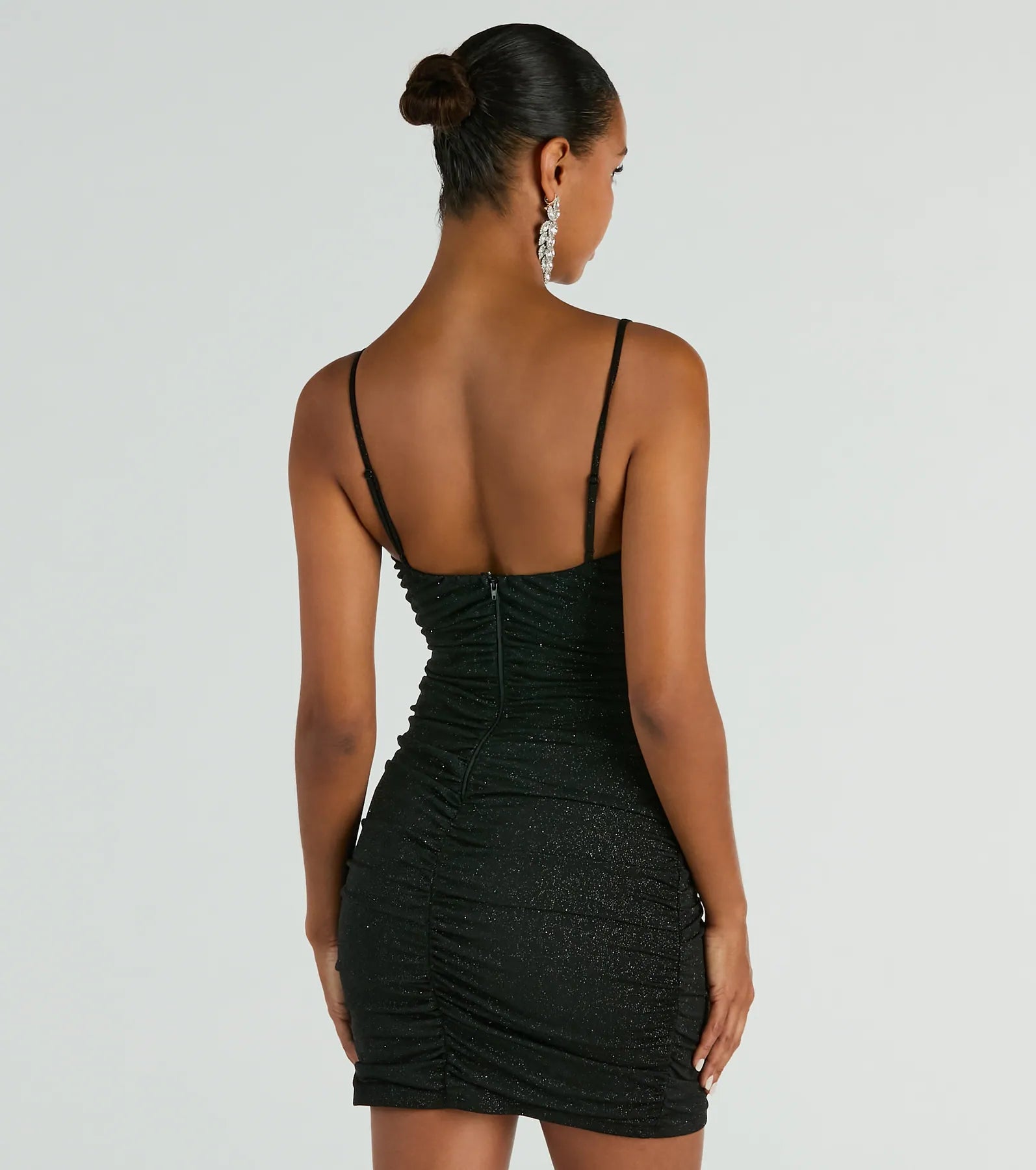 Perfect for brides-to-be or birthday girls! This party dress will enhance your celebration. It has a sleeveless V-neck, adjustable thin straps, and ruched seams on the side and back that highlight your curves in a body-hugging silhouette with a flirty short hem. The dress is made of a glittery knitted fabric with a stretchy knitted lining. Finish the look with platform heels.