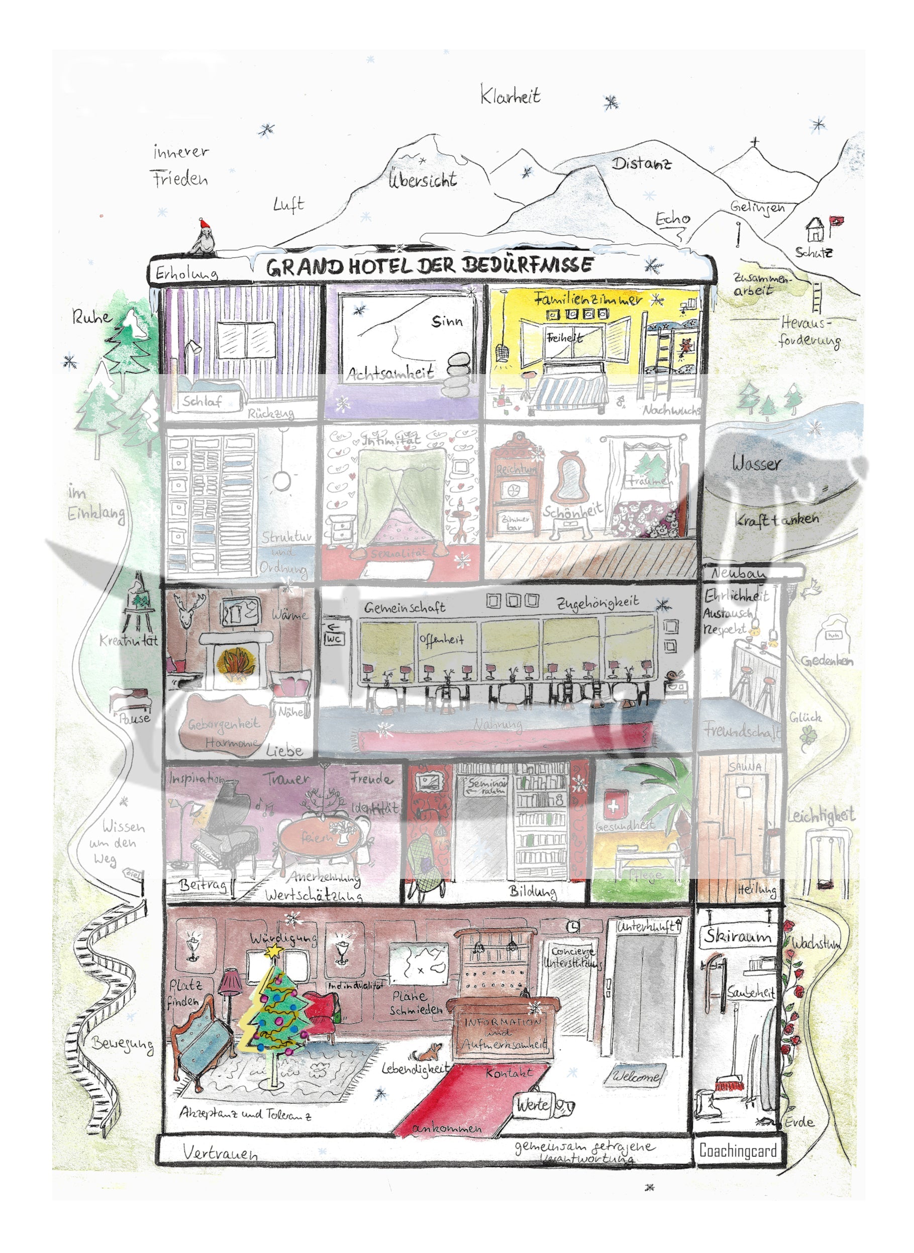 Angelehnt an die Ausarbeitungen von Max-Neef und Rosenberg beinhaltet das Grand Hotel alle relevanten Bedürfnisse, die jede/r von uns im Verlauf seines Lebens verspürt.