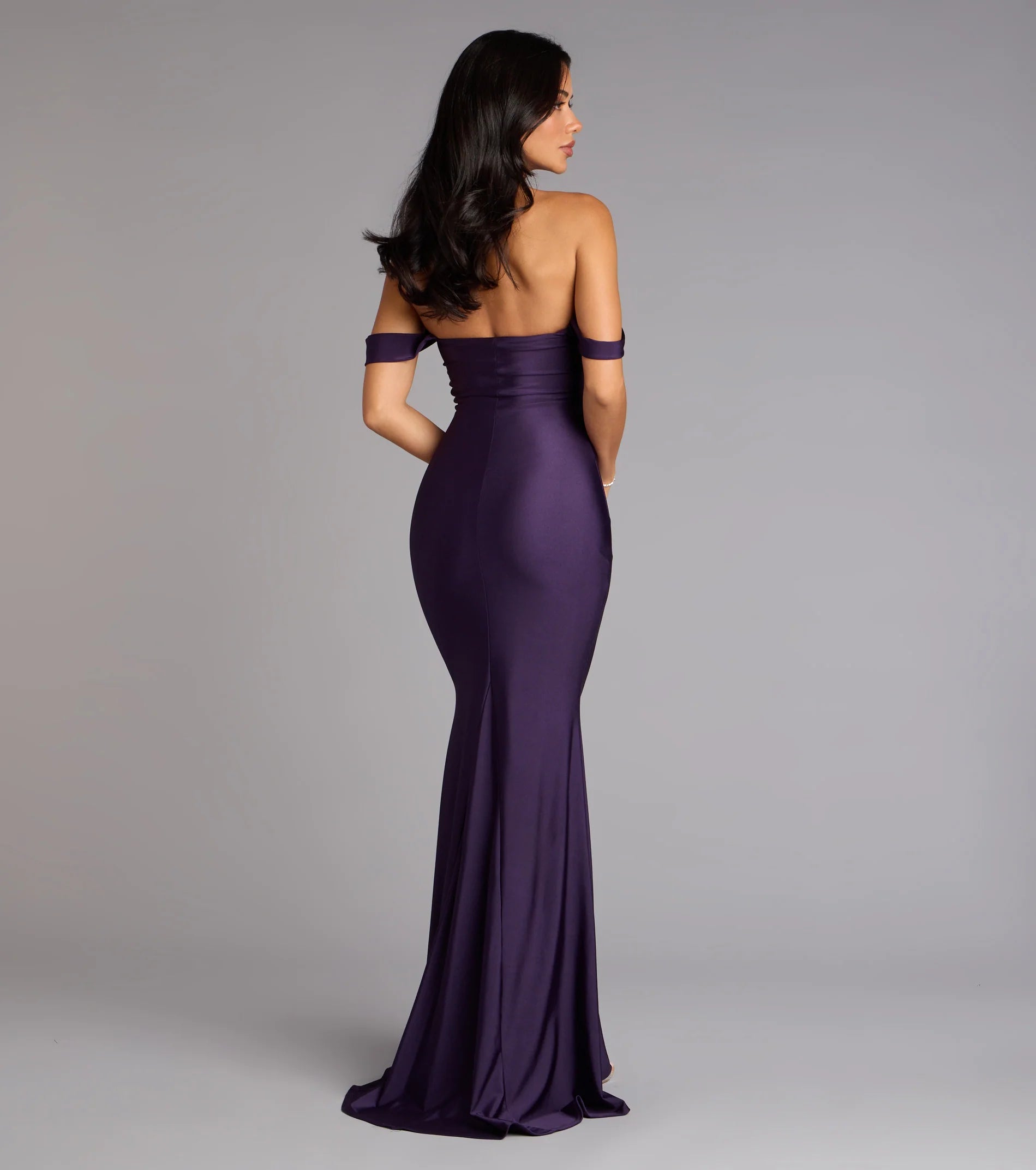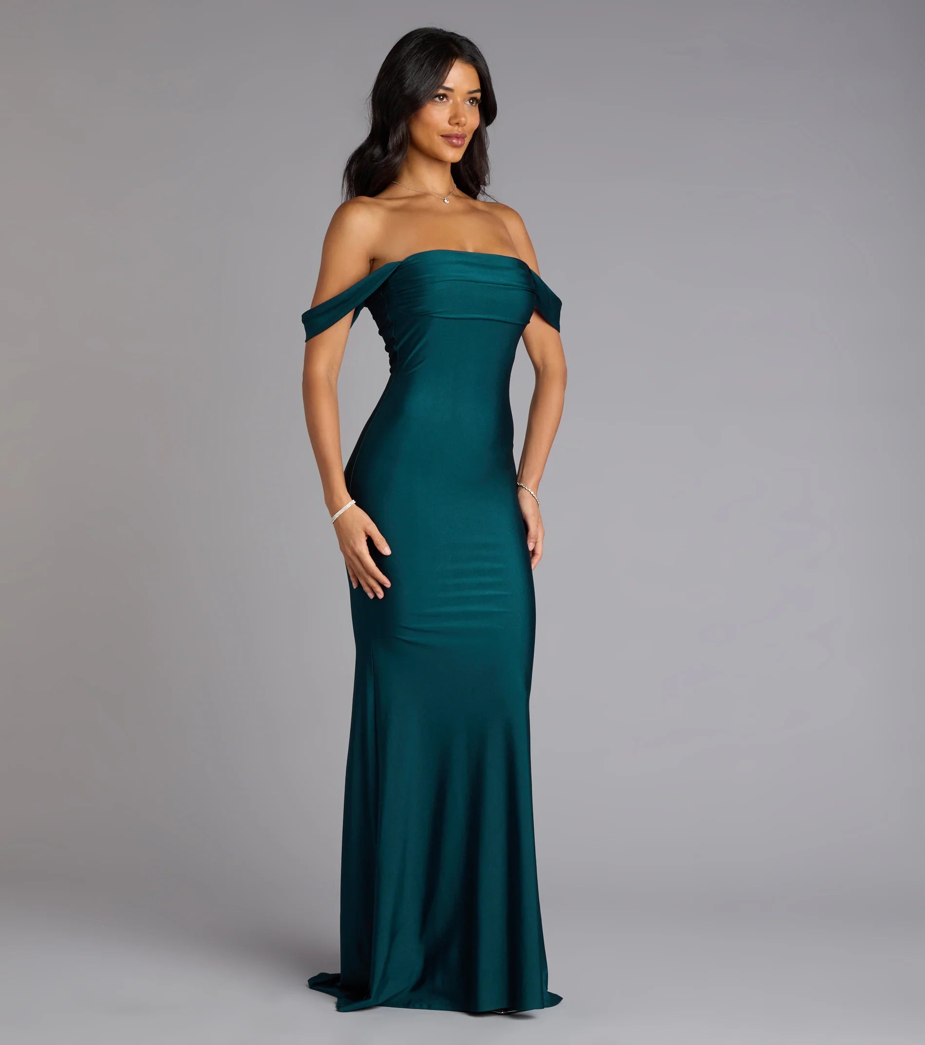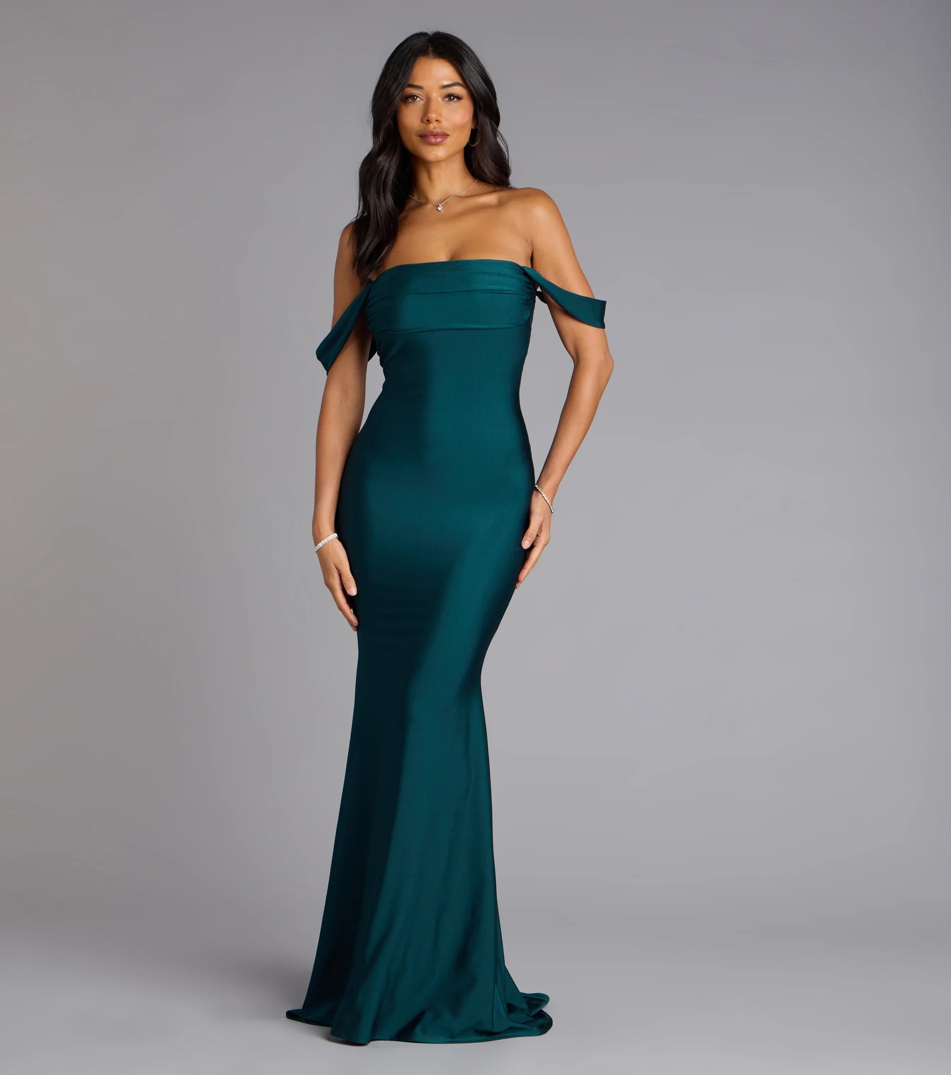 Sleek and oh-so-stunning, the Maylah mermaid dress will serve chic allure with its off-the-shoulder neckline and floor-length curve-hugging silhouette. Style with a rhinestone necklace and stiletto heels.