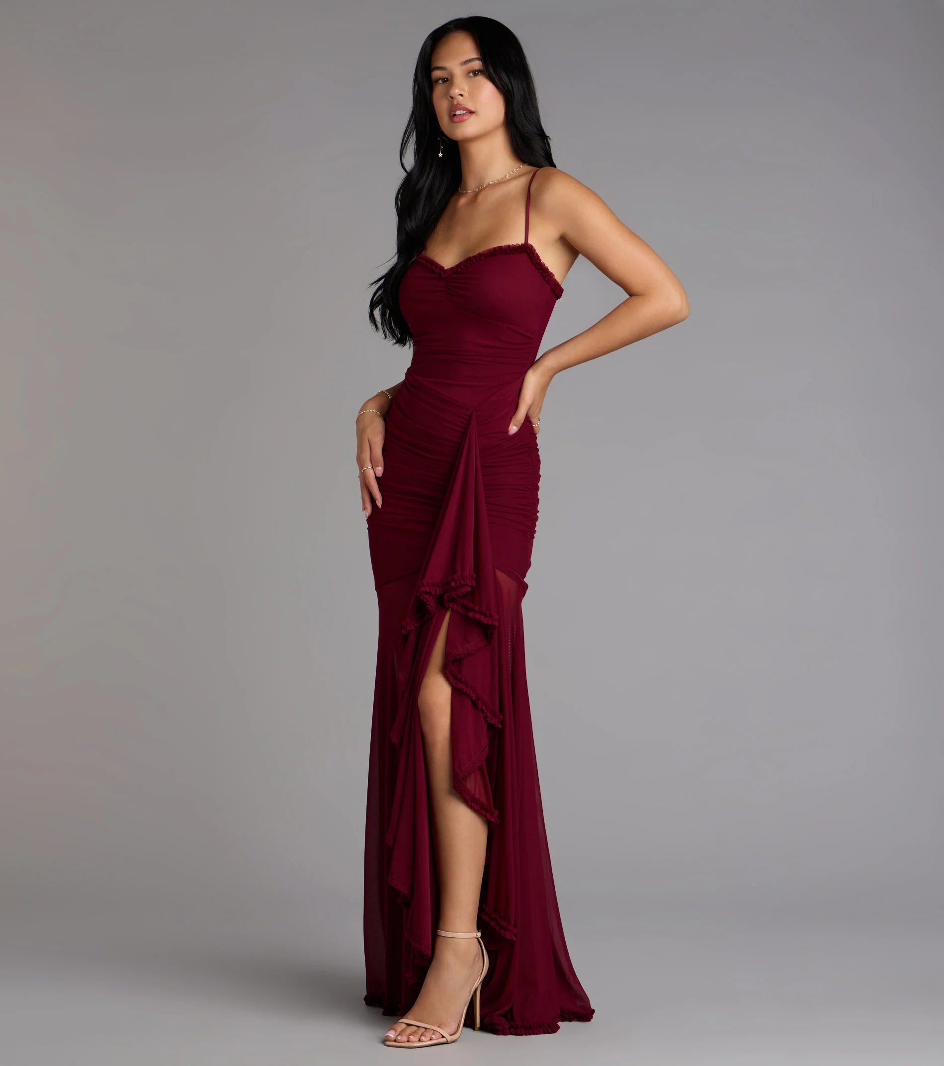 Designed to make every step memorable, this mesh dress has a ruched bodice, fine straps, and a flowing ruffled slit that brings in movement and charm. The well - fitted shape glides smoothly, offering the perfect blend of romance and drama.