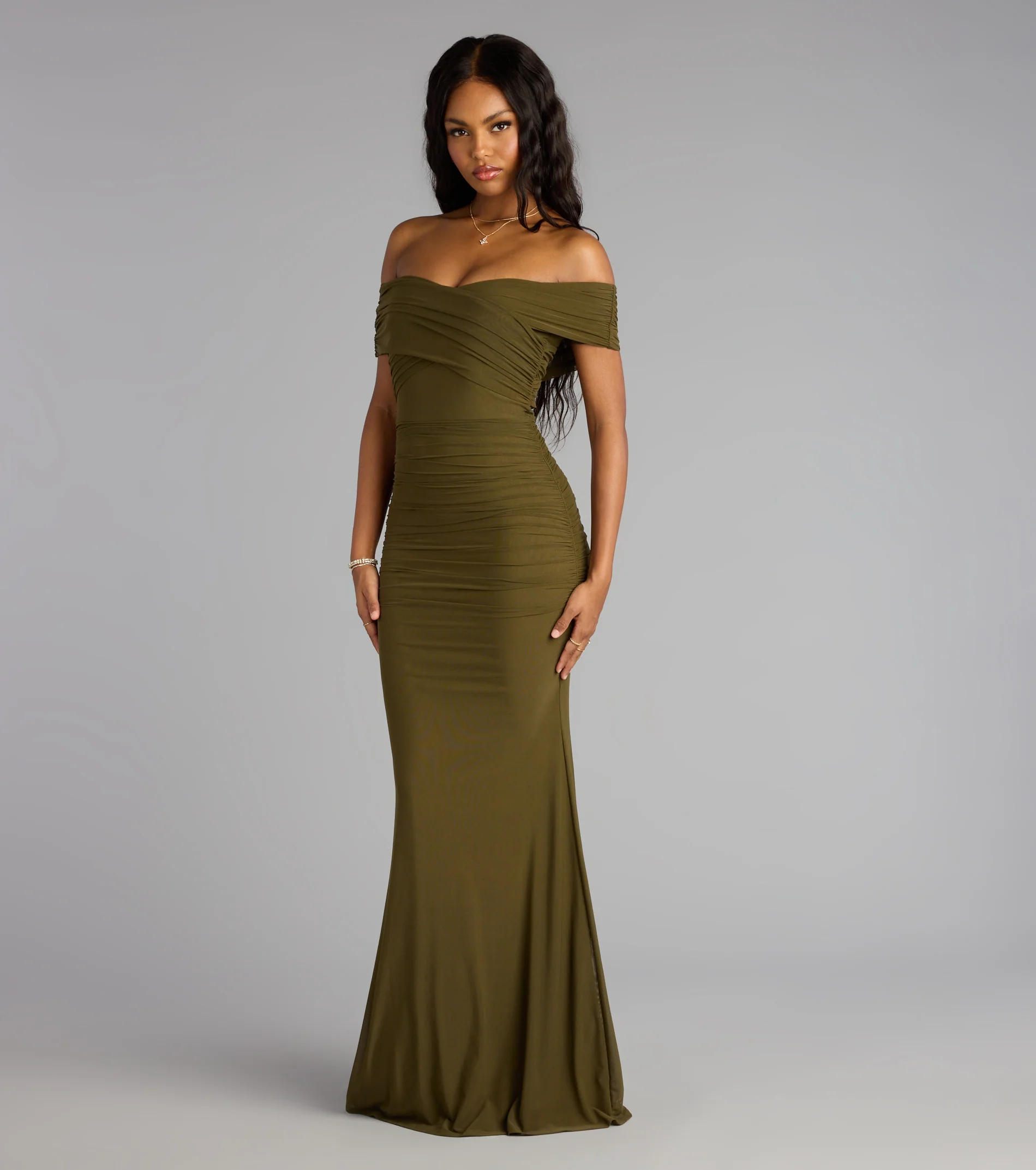 Designed for the spotlight and shaped to impress, this gown is perfect for those special moments. Made from form-fitting mesh with ruching all over and an elegant off-shoulder neckline, this mermaid dress adds just the right amount of flair.
