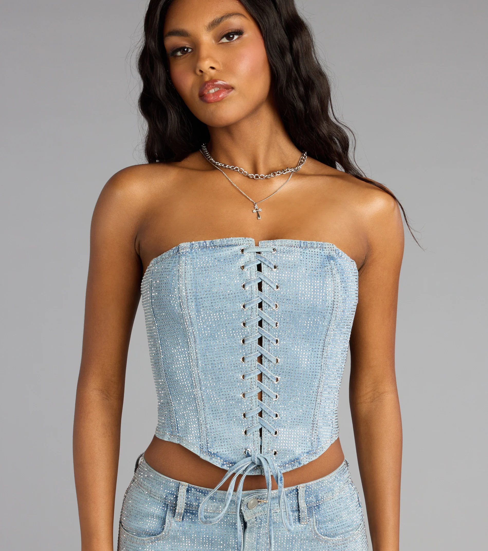 When denim combines with sparkle, this strapless corset top is eye-catching. It features allover rhinestone embellishments and a lace-up front, allowing you to adjust the style from casual glamour to a bold statement.