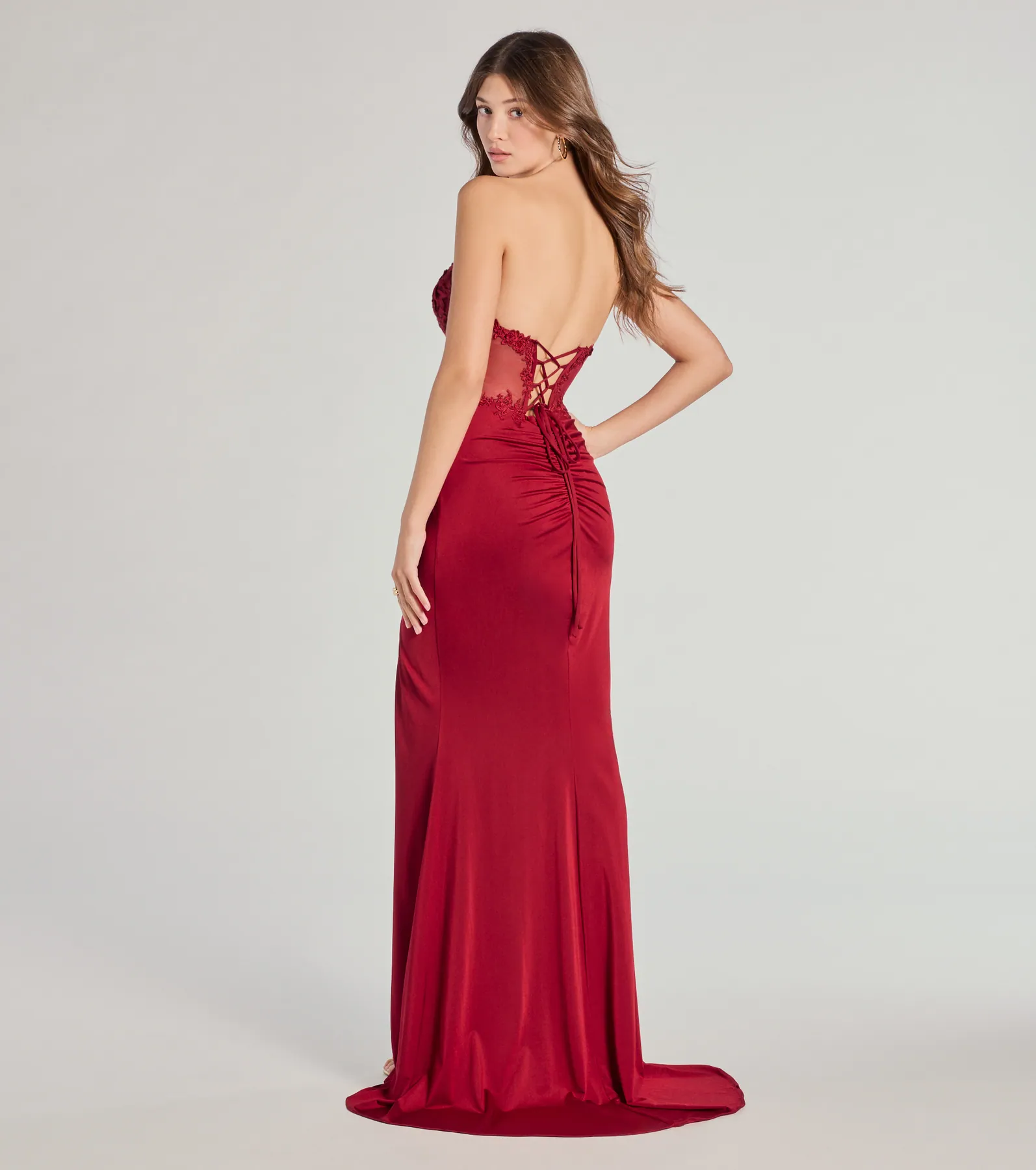 Designed to draw attention, this long formal dress adds an alluring touch to any formal event! A curved neckline and sheer mesh lace corset bodice craft an elegant silhouette, and the lace-up back ensures a customized fit.