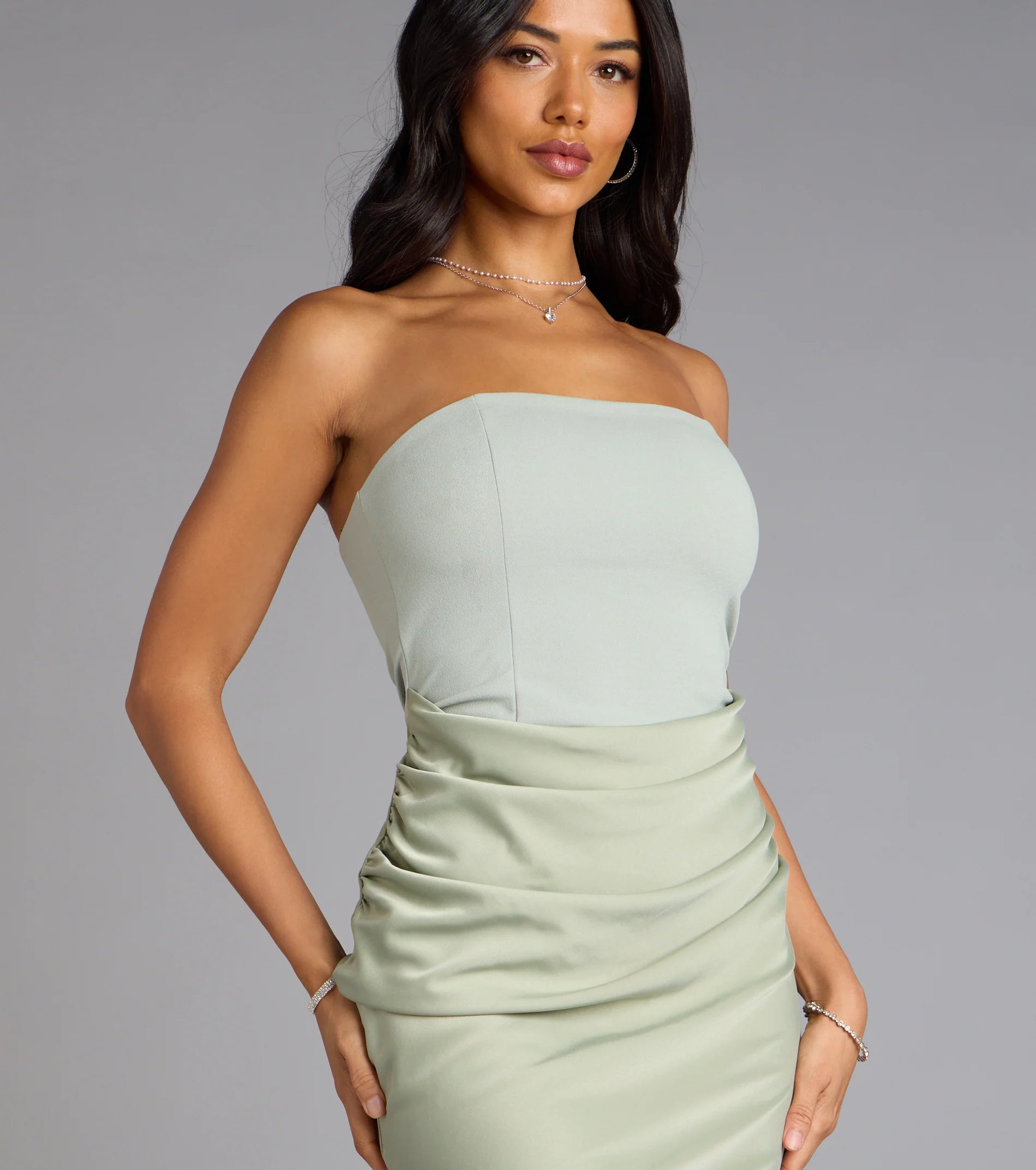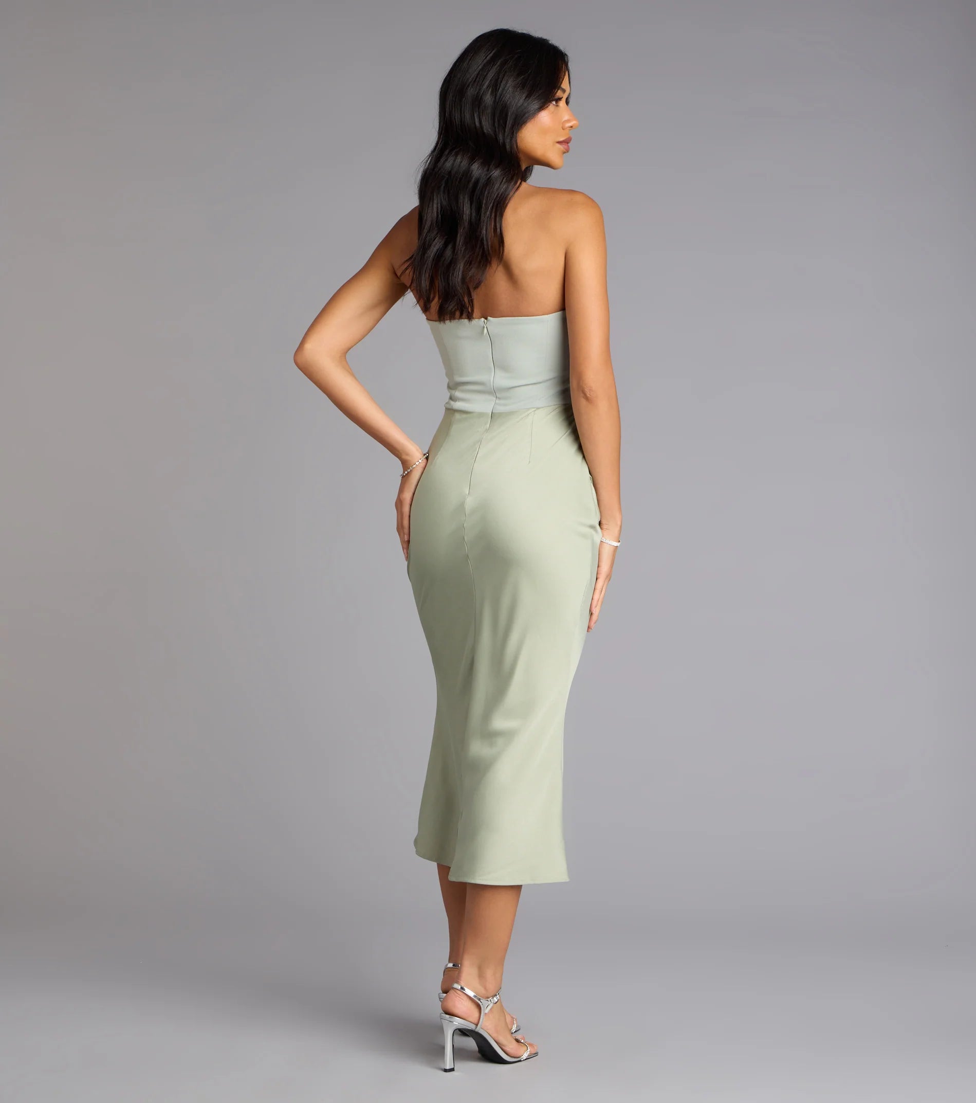 When classic style meets modern fashion, you have this elegant strapless satin midi dress. With a smooth, body-hugging fit and a luxurious sheen, it's perfect for cocktail parties or any event where you want to look glamorous.
