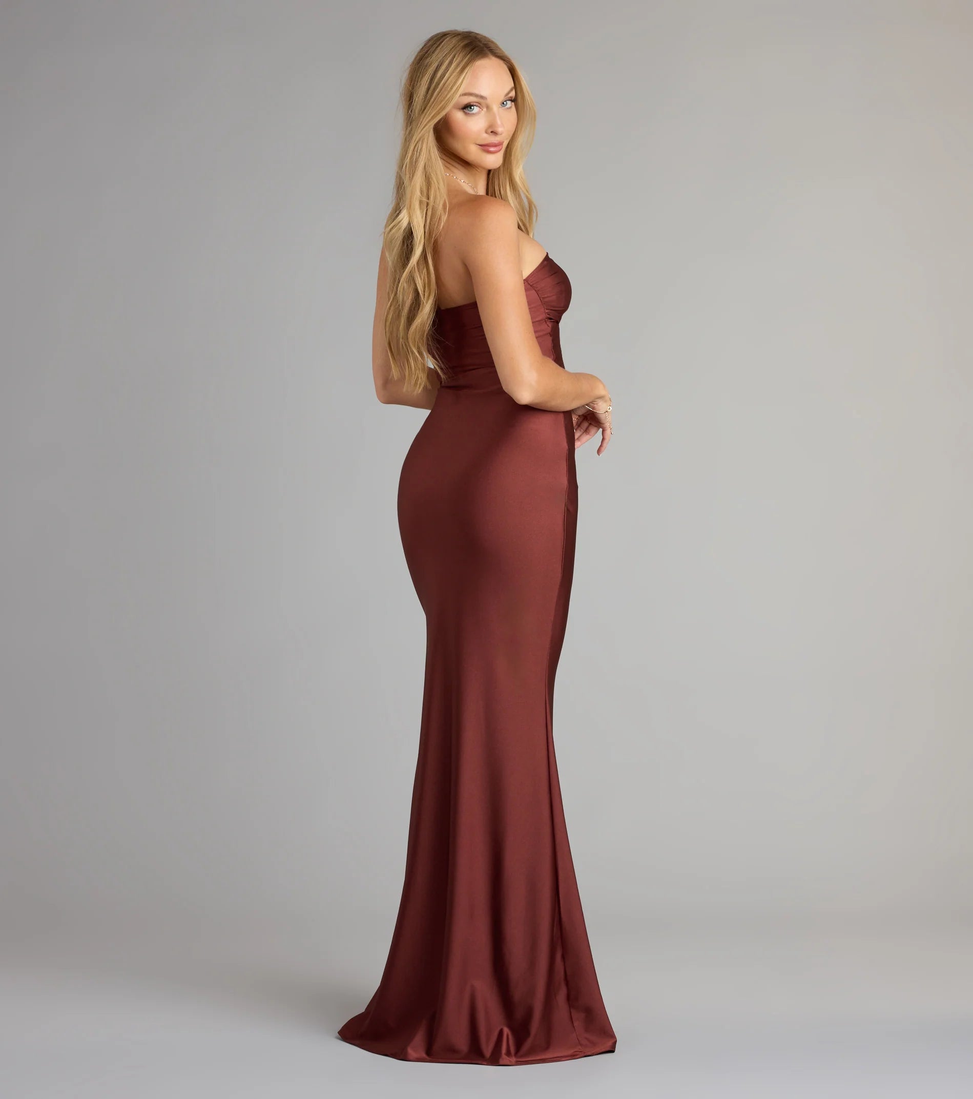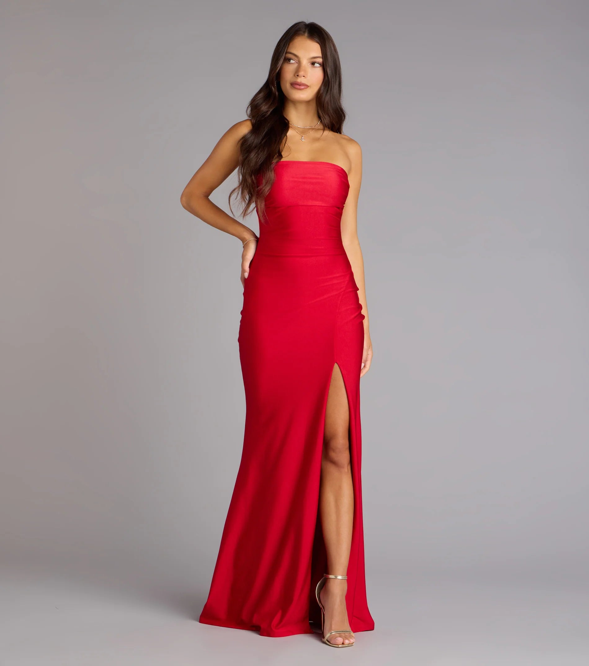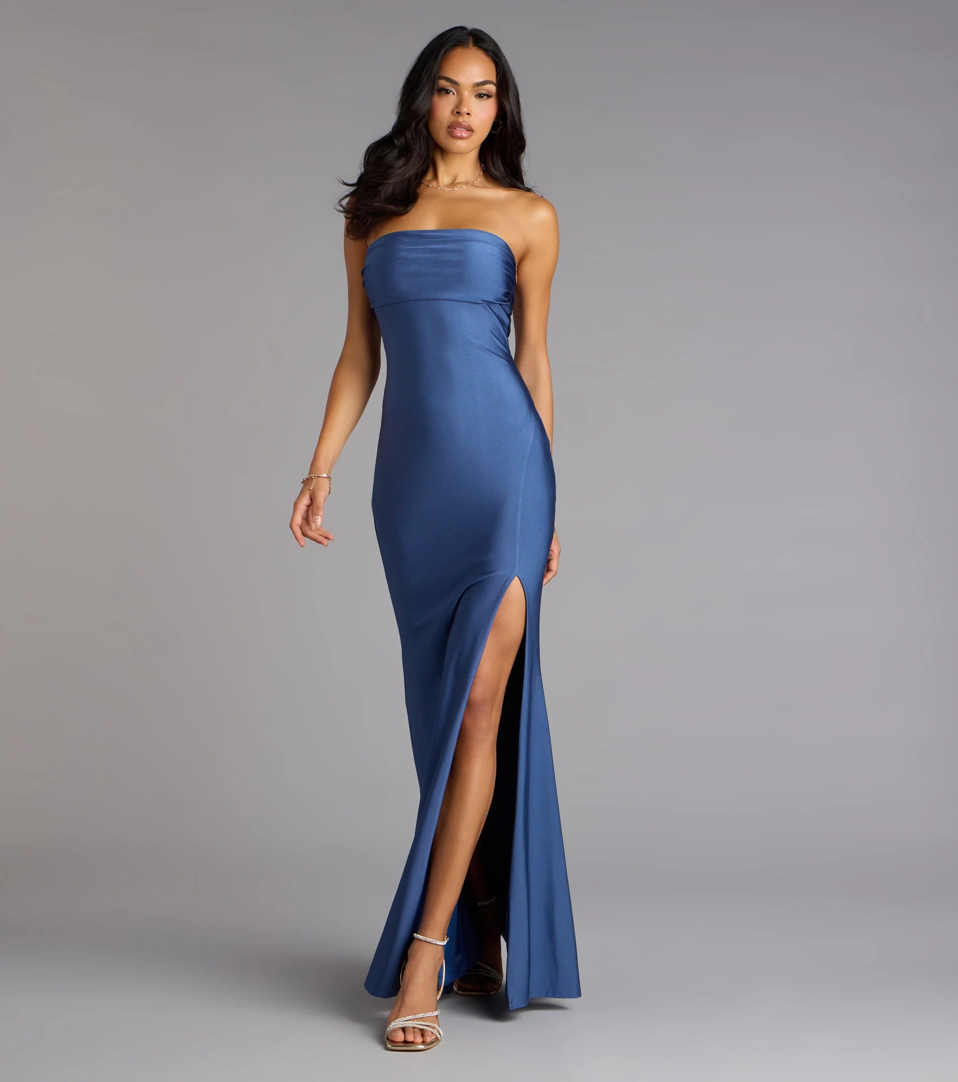 This modern and elegant strapless formal dress is extremely stylish. It has a high slit for easy movement and a mermaid silhouette that enhances your figure!