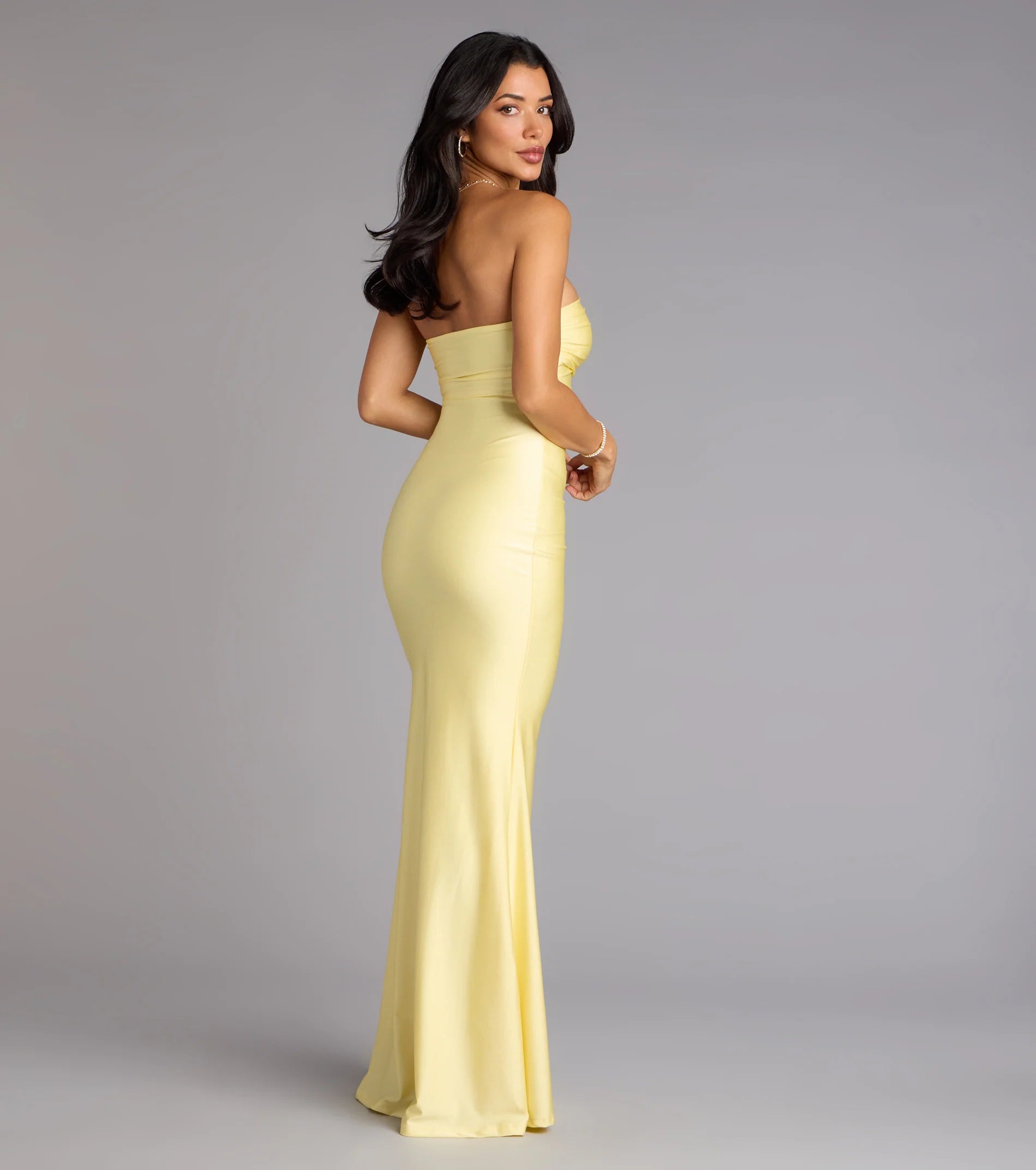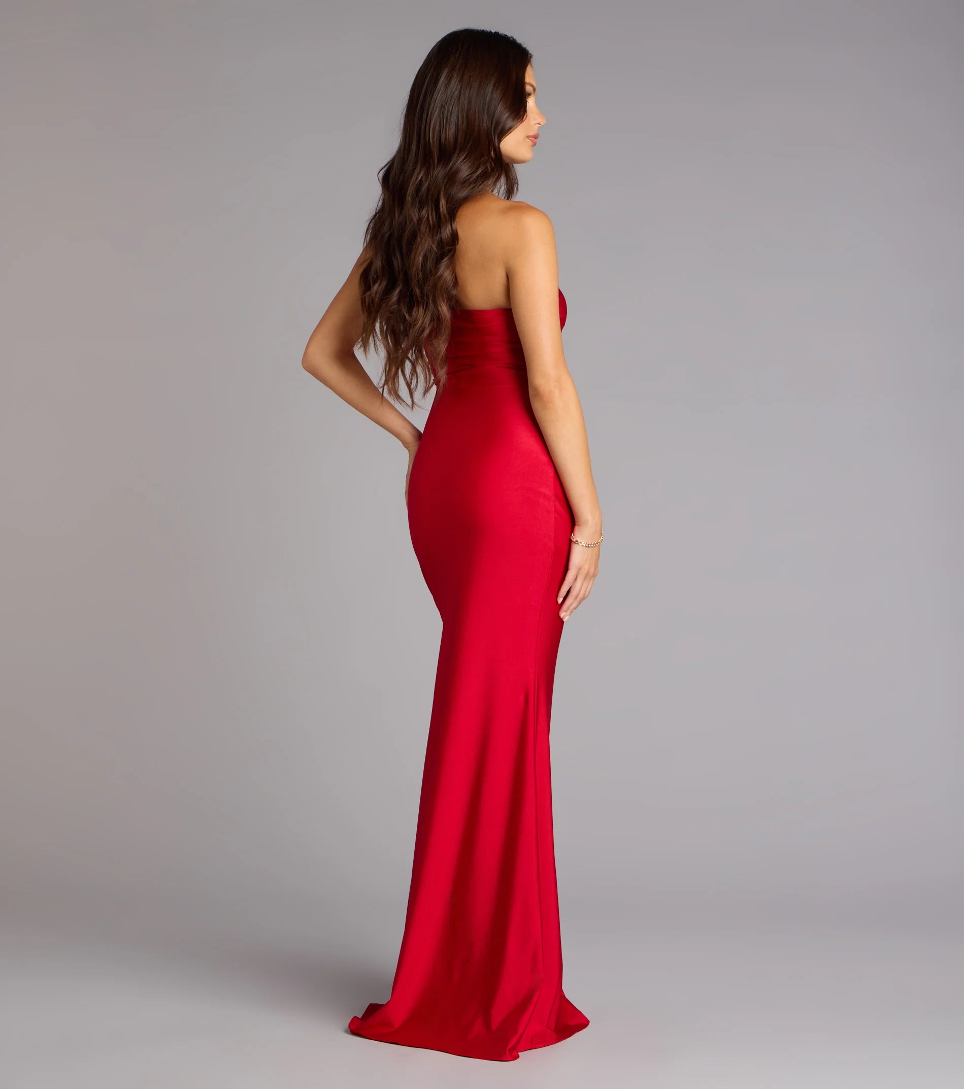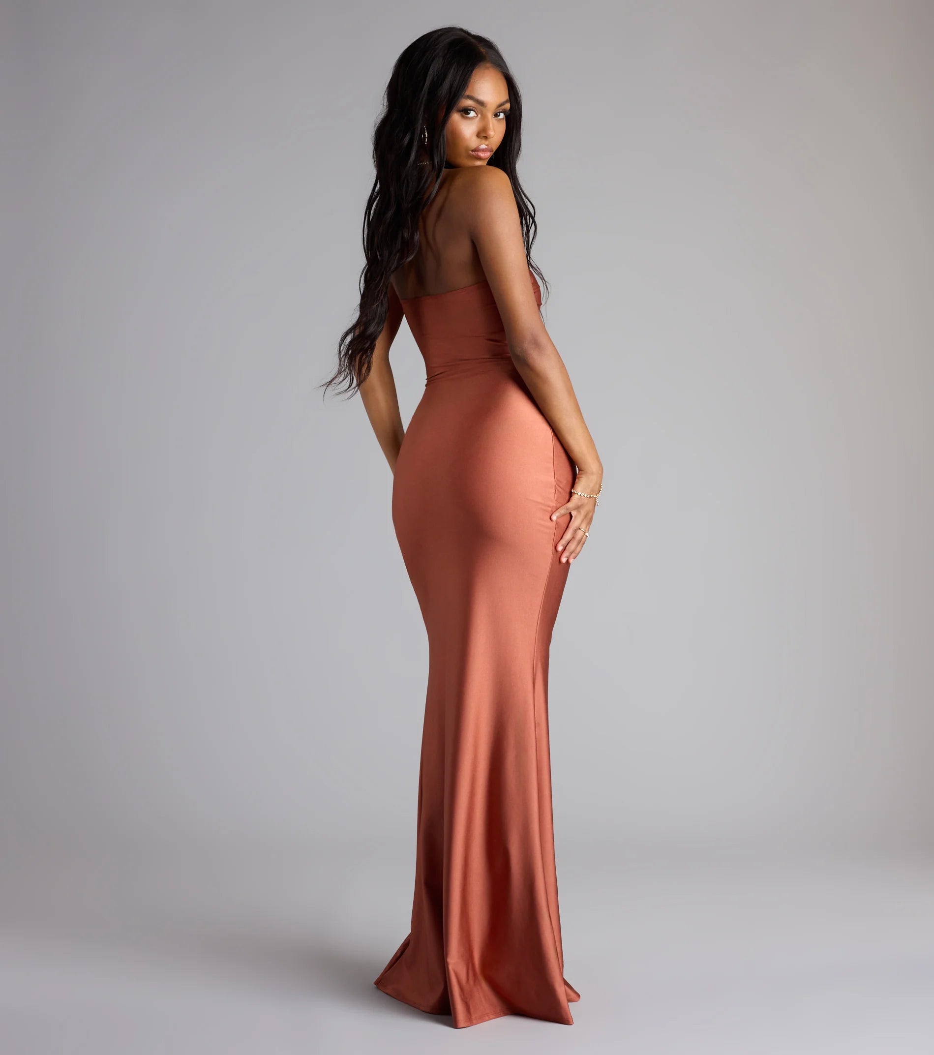 This modern and elegant strapless formal dress is extremely stylish. It has a high slit for easy movement and a mermaid silhouette that enhances your figure!