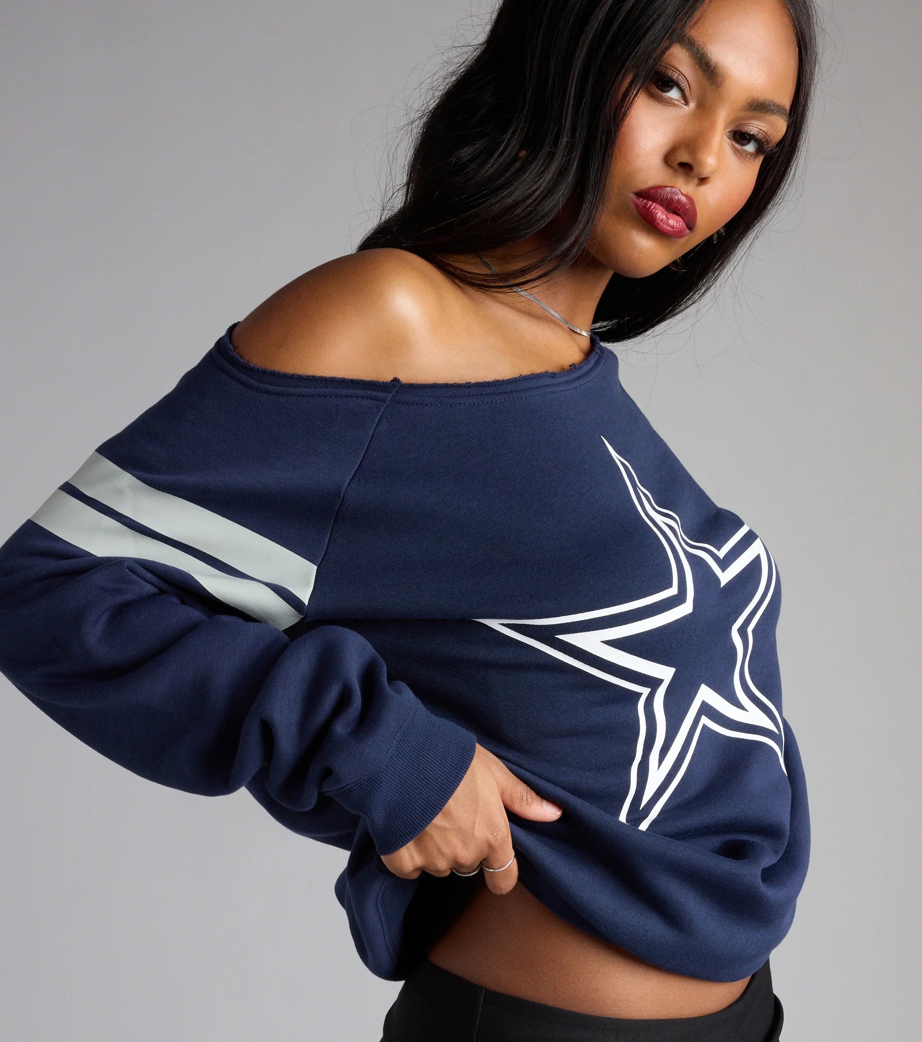 Big star energy—this Dallas Cowboys off-the-shoulder pull-over top is sporty, cozy, and lowkey flirty. Perfect for layering on game day or keeping it casual with your weekend 'fit.